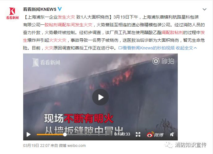 2019年3月19日14時47分許,浦東新區利航路429號星科包裝有限公司一膠粘劑調配車間內,員工孔某(男,40歲,江蘇籍)使用醋酸乙酯調配膠粘劑的過程中發生爆炸并引起火災,火災蔓延至相連接的速必雅精模有限公司。