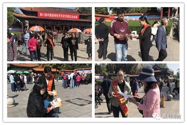 在牡丹文化節期間,消防志愿者深入龍門石窟、白馬寺、中國國花園、國際牡丹園、洛邑古城、王城公園、關林廟、隋唐城遺址植物園等涉會場所,向游客發放消防購物袋、消防玩偶筆、《全民消防安全知識手冊》等禮品和資料,為國內外游客展現洛陽消防良好形象,大力普及消防安全知識,營造良好的消防安全氛圍。