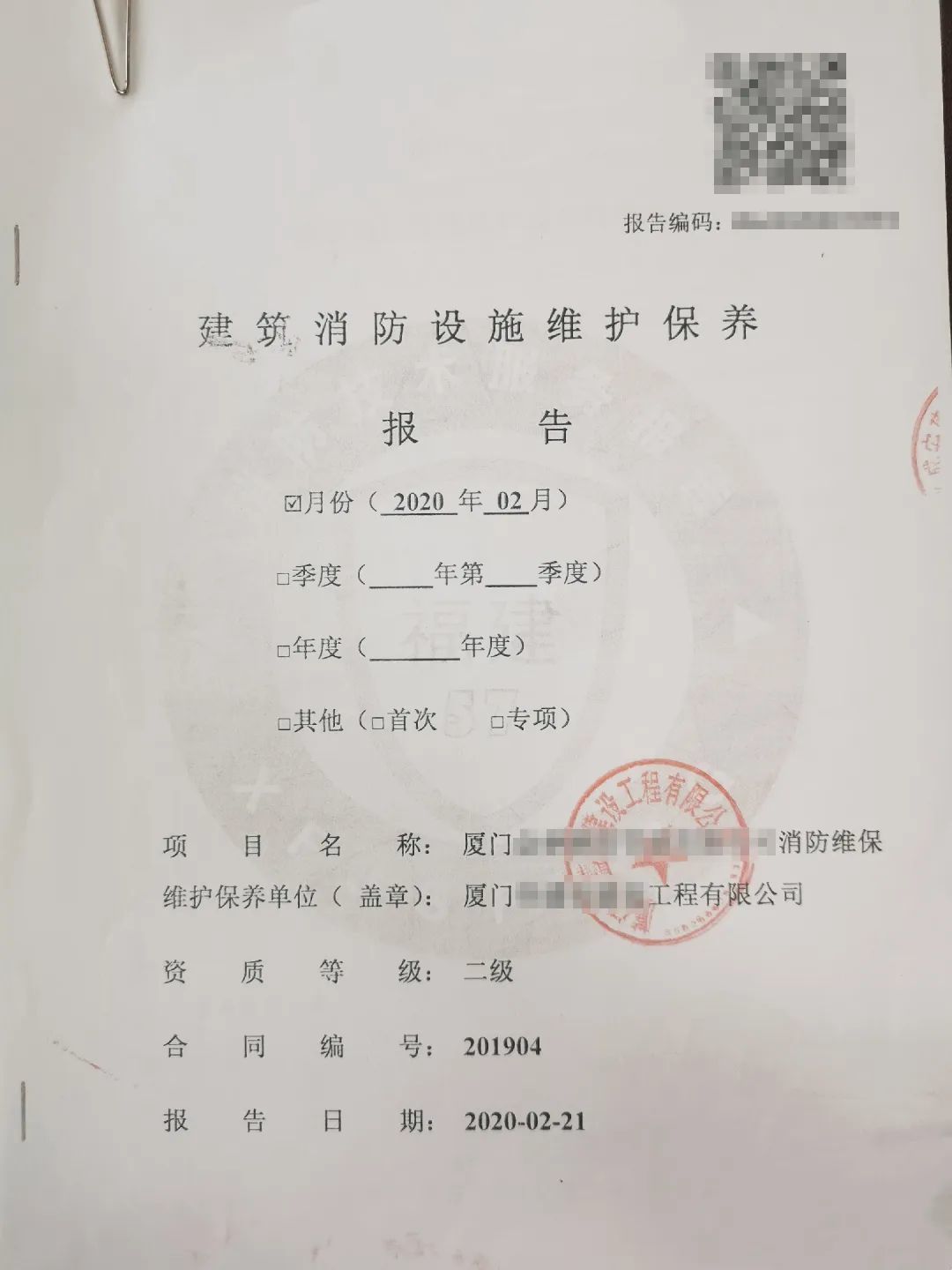 6月中旬,集美區消防救援大隊依法對轄區一家快捷酒店進行“雙隨機,一公開”監督抽查,在檢查該酒店消防設施維護保養情況時,消防監督人員查閱了5月份的《建筑消防設施維護保養報告》,并當場通過福建消防技術服務信息平臺,核對報告的真實性。然而,消防監督人員發現,這份《報告》并未按照規定在該平臺上備案,竟然還出現了只有上傳平臺后才有的“水印”和報告“編碼”。