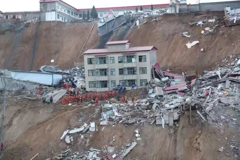 山體滑坡位置在棗嶺鄉的衛生院后院,滑坡導致衛生院一棟家屬樓和信用社一棟家屬樓、一座小型洗浴中心樓垮塌。在衛生院緊靠的北側山溝內,一棟樓整體滑落至半山腰,另外兩棟樓垮塌散落溝坡,大部分被黃土掩埋。