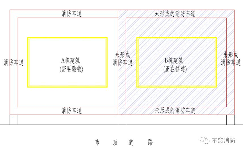 開發分為兩期,A、B棟各一期,每棟6個單元。其中A、B棟中間的道路共用,作為消防車道的一部分。現在A棟已經修好準備交付,B棟剛剛動工,圖中斜線陰影區域為正在修建的部分。由于中間共用車道還未完成。所以形成不了環形車道。