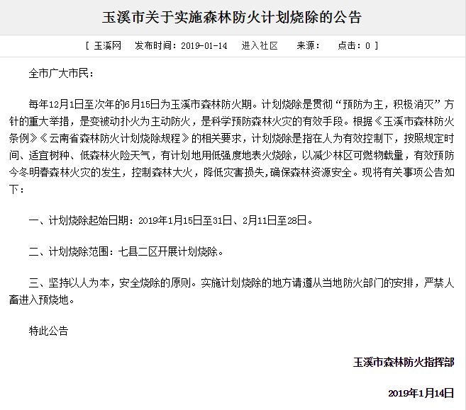 根據中共玉溪市委、玉溪市人民政府主辦的玉溪網上月14日發布的一則公告顯示:當地計劃于2019年1月15日至31日、2月11日至28日在玉溪七縣二區開展計劃燒除。
