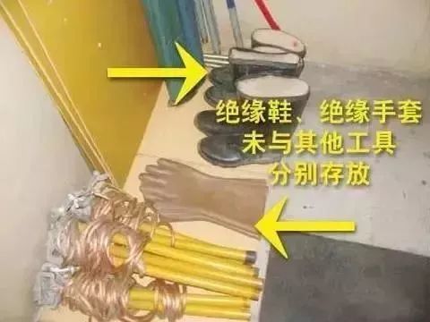 排查依據:DB 11527-2008《變配電室安全管理規范》5.18.5 絕緣靴、絕緣手套應存放在密閉的櫥內,并與其他工具一表分開存放。