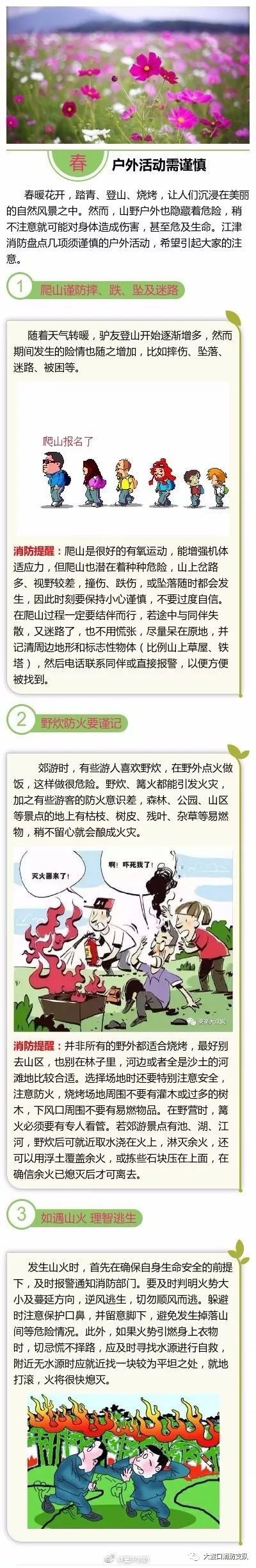 春暖花開,踏青、登山、燒烤,讓人們沉浸在美麗的自然風景之中。然而,山野戶外也隱藏著危險,稍不注意就可能對身體造成傷害,甚至危及生命。潤宇消防盤點幾項須謹慎的戶外活動,希望引起大家的注意。