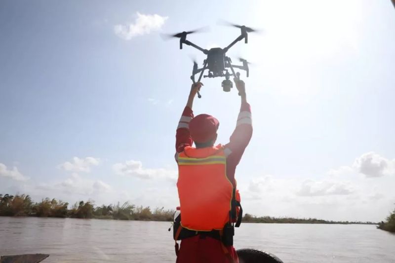 中國(guó)救援隊(duì)隊(duì)員利用無(wú)人機(jī)進(jìn)行偵察