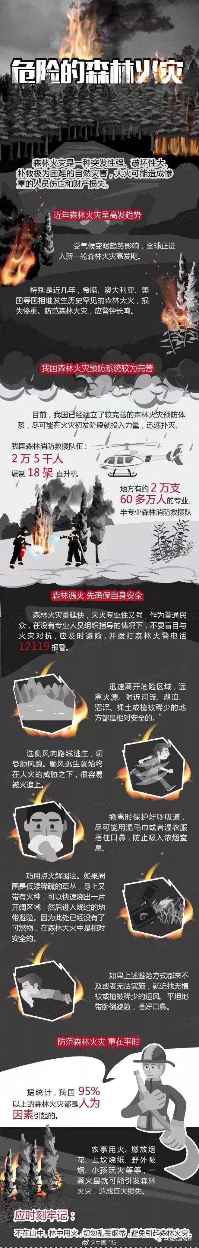 白夜說,在滅火救援時,消防隊員要偵察好火場,盡量避開危險地形、危險植被類型,避開危險的氣象條件科學撲救;發生險情時切記不要順風逃生,不要往山上逃生,不要經鞍部逃生等。有條件點火時,可跟進無剩余物的火燒跡地避險。實在沒有逃生辦法時可用濕毛巾堵住口鼻,包裹好裸露的皮膚迎火沖出火線。