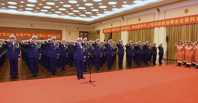 上海展覽中心友誼會堂氣氛莊重熱烈,350余名身著新式制服的消防救援人員精神抖擻、整齊列隊,以昂揚飽滿的精神狀態等候儀式到來。