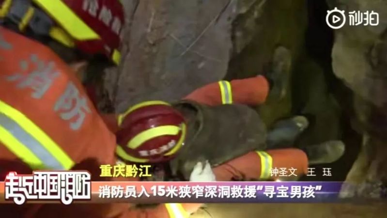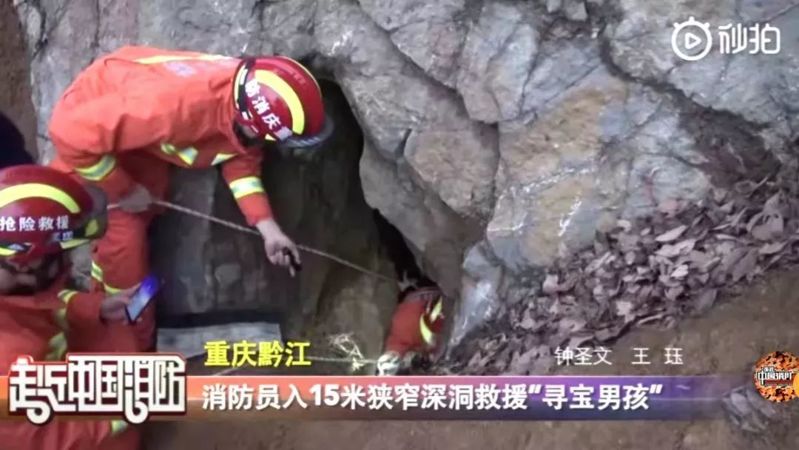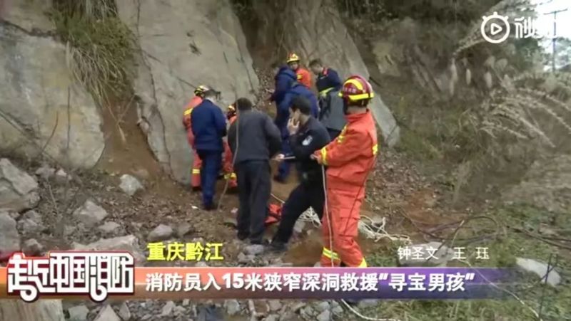 01、2月23日下午,重慶黔江一男孩聽信小朋友的話尋找寶藏,墜入十五米山洞,消防員做好防護(hù)后成功降到洞底將其救出。