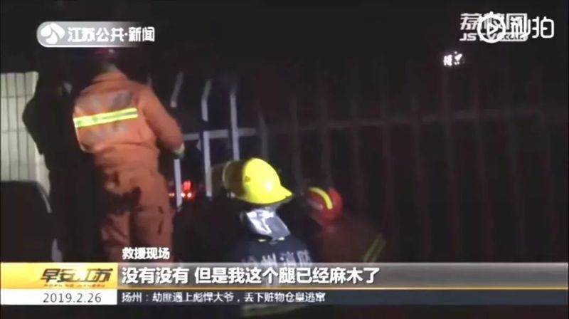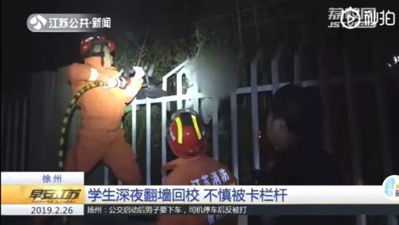 02、2月25日凌晨2時(shí)許,徐州一大學(xué)生翻墻返校時(shí)右腿卡欄桿上,報(bào)警求助,消防員用液壓剪擴(kuò)張,其他幾人托住學(xué)生身體,很快將其解救下來。據(jù)了解,該男生因返校太晚,擔(dān)心被老師發(fā)現(xiàn)才出此下策。