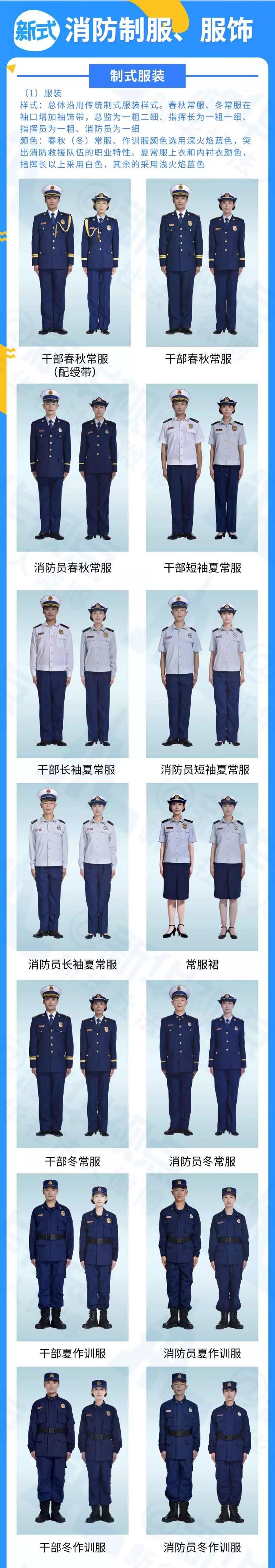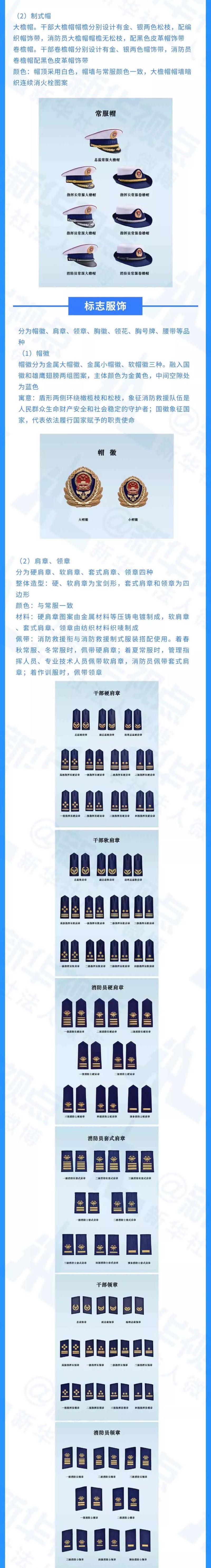 《辦法》明確,消防救援銜標志佩帶在肩章和領章上,肩章分為硬肩章、軟肩章和套式肩章,硬肩章、軟肩章為劍形,套式肩章、領章為四邊形;肩章、領章版面為深火焰藍色。消防救援人員著春秋常服、冬常服和常服大衣時,佩帶硬肩章;著夏常服、棉大衣和作訓大衣時,管理指揮人員、專業技術人員佩帶軟肩章,消防員佩帶套式肩章;著作訓服時,佩帶領章。