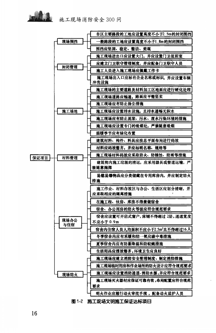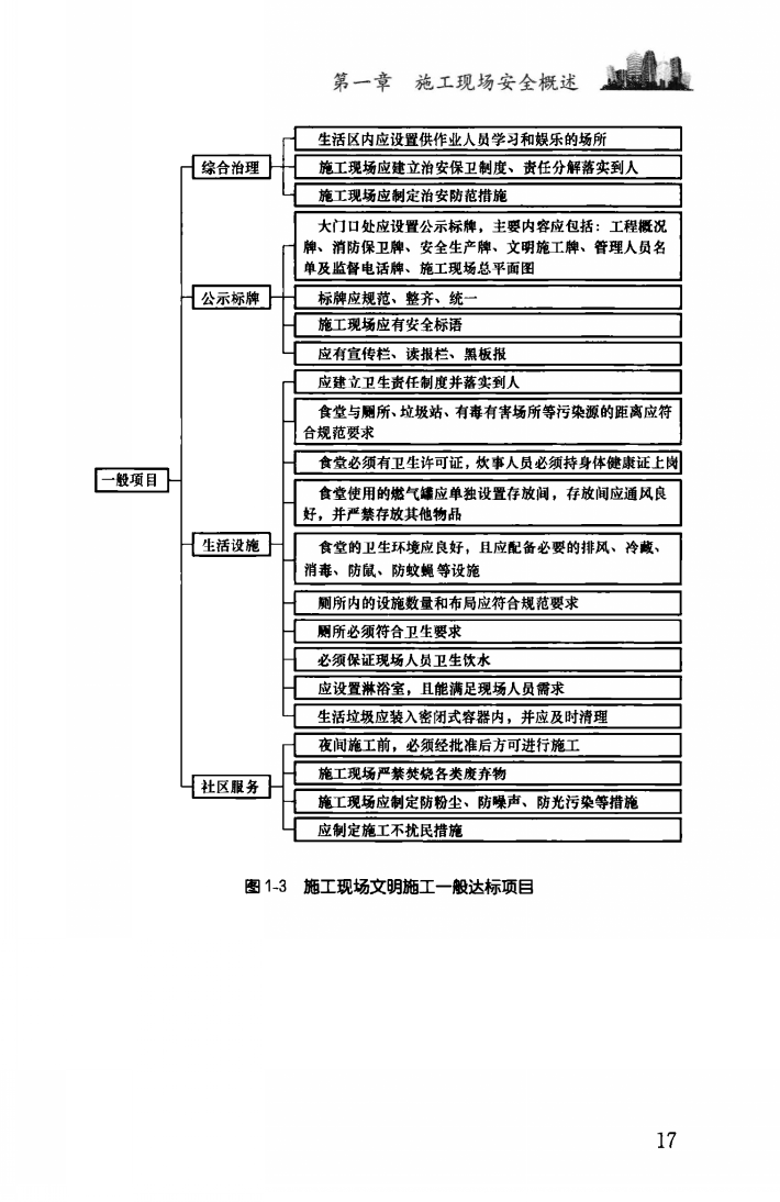 JGJ 59-2011《建筑施工安全檢查標準》對施工現場文明施工達標項目包括保證項目(現場圍擋、封閉管理、施工場地、材料管理、現場辦公與住宿、現場防火)和一般項目(綜合治理、公示標牌、生活設施、社區服務)兩項內容。其達標要求見圖1-2和圖1-3.