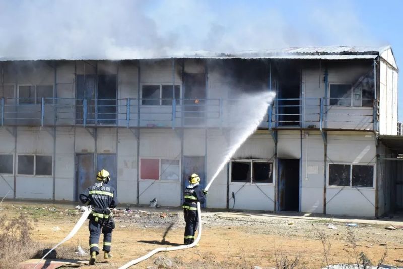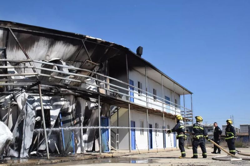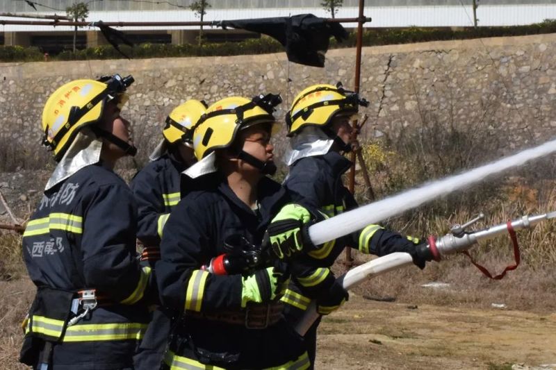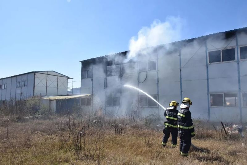 消防指戰(zhàn)員到場(chǎng)后,經(jīng)偵查發(fā)現(xiàn),一彩鋼板房?jī)?nèi)冒著滾滾濃煙,火勢(shì)正處于猛烈燃燒階段,如果不及時(shí)控制,大火隨時(shí)有蔓延的趨勢(shì)。另一處彩鋼板房已經(jīng)經(jīng)過(guò)燃燒坍塌處于下降階段無(wú)蔓延趨勢(shì)。根據(jù)現(xiàn)場(chǎng)情況,指揮員立即下達(dá)作戰(zhàn)命令:壓縮空氣泡沫消防車鋪設(shè)單干線出兩只水槍,首先對(duì)燃燒猛烈的彩鋼板房進(jìn)行控制和消滅火勢(shì),二十五噸水罐消防車負(fù)責(zé)向壓縮空氣泡沫消防車供水,確保水源不間斷,其余人員負(fù)責(zé)輔助并做好現(xiàn)場(chǎng)警戒。