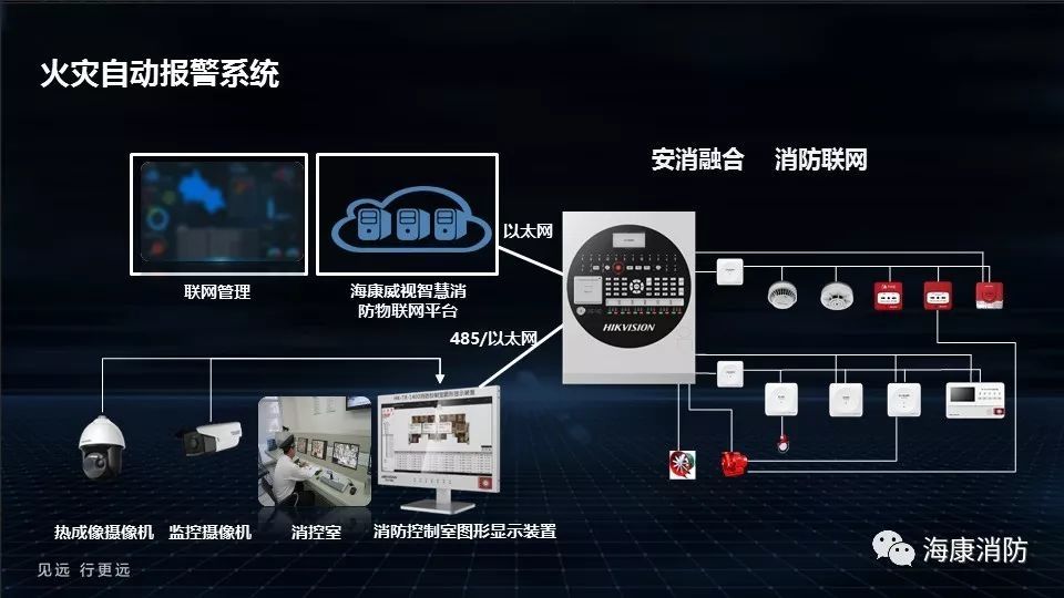 相比于傳統(tǒng)火災(zāi)報(bào)警控制系統(tǒng)而言,海康威視優(yōu)化和升級(jí)了系統(tǒng)參數(shù)、設(shè)備結(jié)構(gòu)、產(chǎn)品性能,集成了遠(yuǎn)程通訊模塊,支持多種組網(wǎng)方式,該系統(tǒng)可直接連接至??低暩黝惥C合安防平臺(tái)系統(tǒng),真正實(shí)現(xiàn)一體化消防遠(yuǎn)程監(jiān)控系統(tǒng)聯(lián)網(wǎng)。