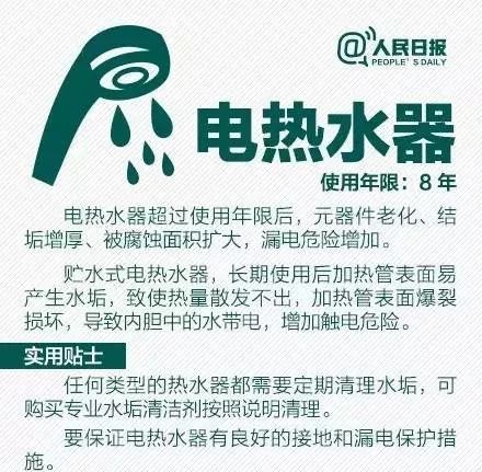 4、電熱水器的使用壽命通常為6-8年,如超過年限還在繼續使用,就會存在安全隱患,需要及時更換。